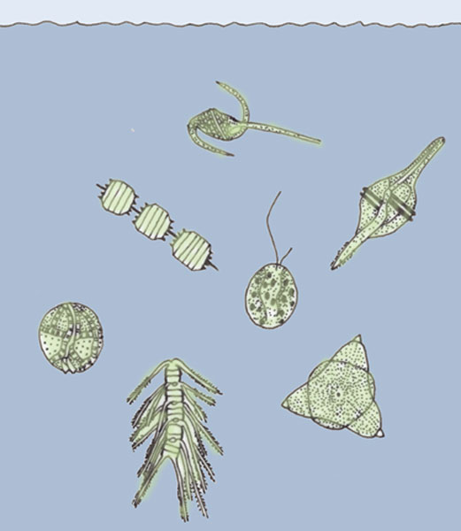 Las algas microscópicas, al igual que los protozoos, están incluidas dentro del Reino de los Proctistas. Estos individuos se caracterizan por ser autótrofas, fotosínté; presentan clorofila y otros pigmentos como carotenos. Realizan la mayor parte de fotosíntesis de la Tierra siendo el primer eslabón de las cadenas tróficas de los exosistemas acuáticos, liberando grandes cantidades de oxígeno a la atmósfera. La estructura celular está rodeada por una pared de celulosa. Las algas unicelulares suelen presentar flagelos para realizar su desplazamiento. Forman una parte importante del plactón. La forma de reproducción puede ser asexual, por bipartición, o asexual. En algunos grupos lareproducción sexual se realiza cuando las condiciones del medio son desfavorables.